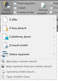 Główną funkcją Power Query jest „Nowe zapytanie”. Służy ona do definiowania wczytania czy modyfikacji danych, na którym będziemy pracować dalej. Co wyróżnia tą funkcje to to, że wszystko co robimy na danych będzie zapisywane w postaci kolejnych kroków. Kroki te możemy również modyfikować (zmieniać kolejność, usuwać itp.). Gdy wybierze się „Nowe zapytanie” rozwinie się menu dające wybór źródła danych: