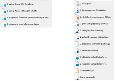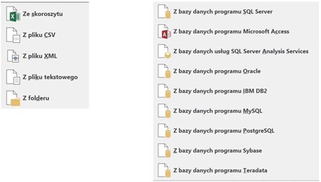Podobnie jak ma to miejsce w Power Pivot, mamy bardzo bogaty wybór źródeł danych: