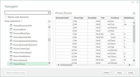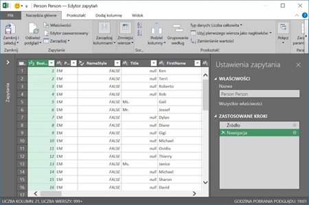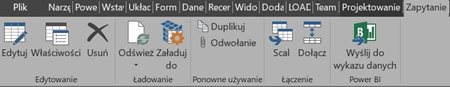 W tej zakładce kluczową opcją jest Edycja. Można by spytać „Ale czego edycja, przecież tylko wczytaliśmy dane ?”. I to jest właśnie clou - edycja procesu wczytywania danych. Gdy wybierzemy tą opcję pojawi się nowe okno (tak jak w Power Pivot) nazwane „Edytor zapytań”: