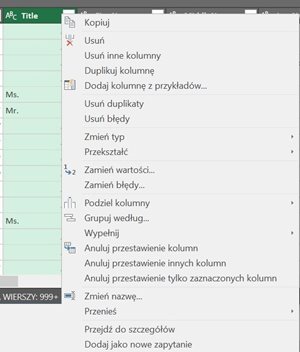 Po kliknięciu prawym przycisku myszki na kolumnie pojawi się menu czynności, które można na tej kolumnie wykonać:
