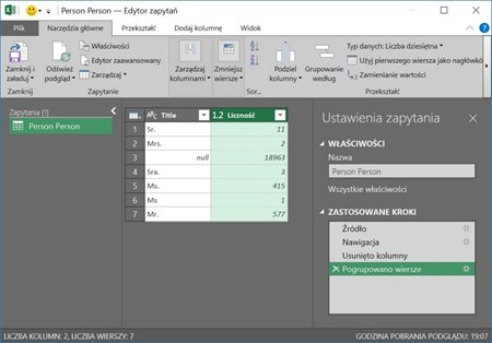 Teraz można modyfikować zbiór danych. Każda czynności zostanie zapisana w oknie „Zastosowane Kroki”. Całość stanie się automatycznym procesem zaczytywania i przekształcania danych, które będą potem wykorzystywane dalej nie tylko w MS Excel ale także mogą zostać wykorzystane do załadowania do PowerBI online.