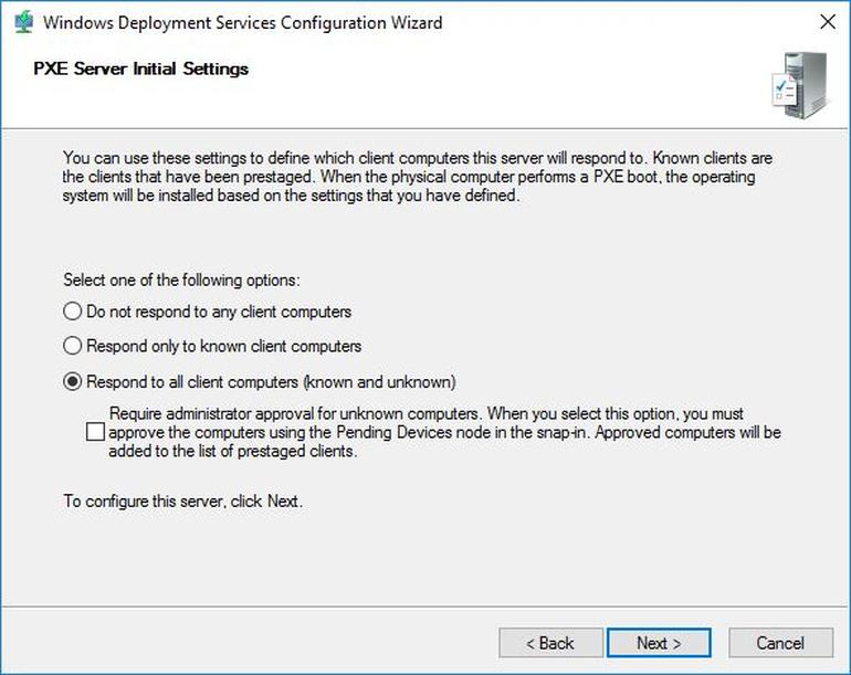 Opcja „Respond only to known client computers” - serwer odpowiada na zapytania wyłącznie klientom znanym, tj. posiadającym w domenie preinstalowane konto komputera wraz z przypisanym do niego identyfikatorem GUID.