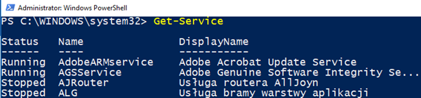 W powyższym przykładzie polecenie Get-Service pobiera wszystkie usługi z lokalnego komputera. Polecenia mogą dodatkowo zawierać parametry modyfikujące ich działanie